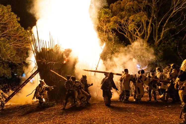 巨大な松明「すずみ」に火を灯し、東西2組に分かれた男たちが炎の中に飛び込み、その中に納められた神木と十二縄を競い合って取り出し、神前に供えます。