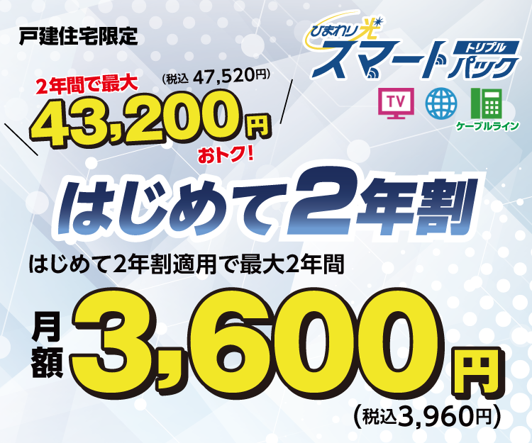 ご利用開始月(工事完了日が属する月)を含めた最大2年間(24ヶ月間)、ひまわり光「スマートパックトリプル」の月額基本料金 通常5,400円(税込5,940円)より、毎月1,800円(税込1,980円)を割引して、月額基本料金3,600円(税込3,960円)となります。