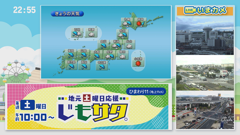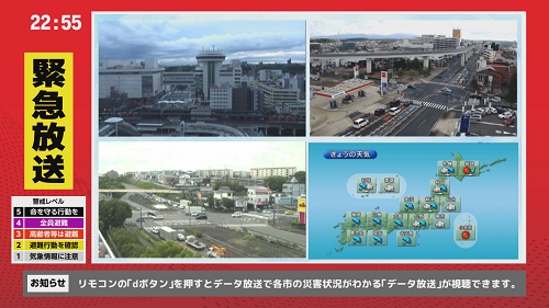 平時は、「お天気情報」と、今まで以上に見やすくなった「リアルタイムカメラ映像」が交互に映し出され、地域ニュースも入手できるようにリニューアル。また、地震などの緊急時には、画面レイアウトを変更し地域の情報を発信します。