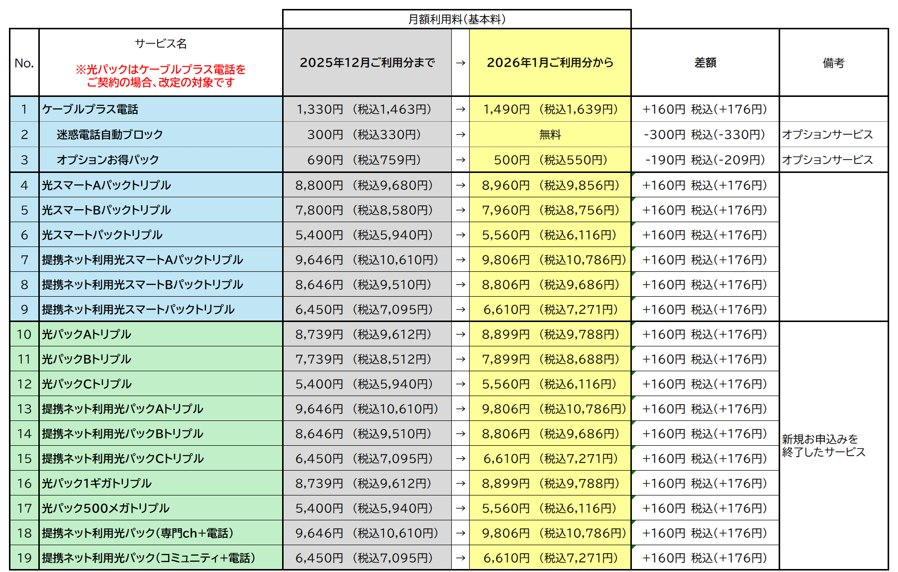 光パックでケーブルプラス電話をご契約の場合も改定の対象です(割引期間中の場合は下記の差額分が加算されます)。