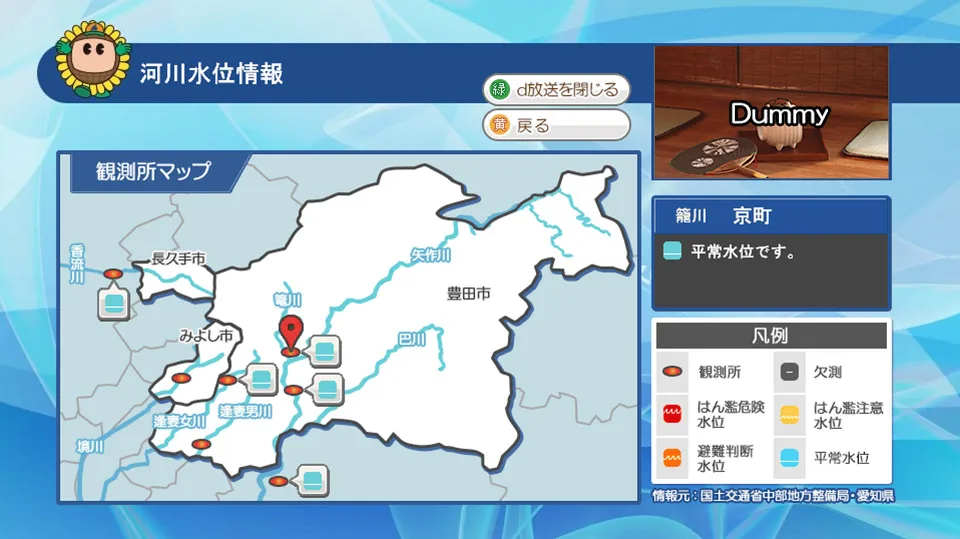 • 台風やゲリラ豪雨などによる河川の氾濫は、命に関わる危険があります。ひまわりエリア内外にある7か所の観測所の情報から、現在の河川水位を確認できます。