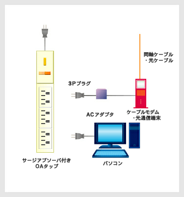 一つの「サージアブソーバ付 OA タップ」にケーブルモデム・光通信端末とパソコン機器の電源を接続する。